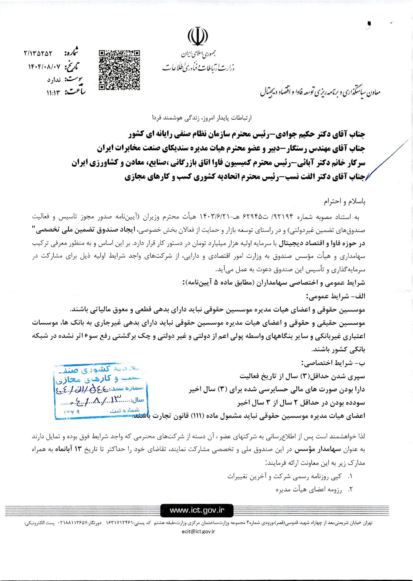 در راستای حمایت از شرکتهای فعال در حوزه فناوری اطلاعات و ارتباطات و توسعه زیستبوم اقتصاد دیجیتال کشور، صندوق تضمین ملی تخصصی فاوا و اقتصاد دیجیتال با سرمایه اولیه هزار میلیارد تومان تأسیس خواهد شد.