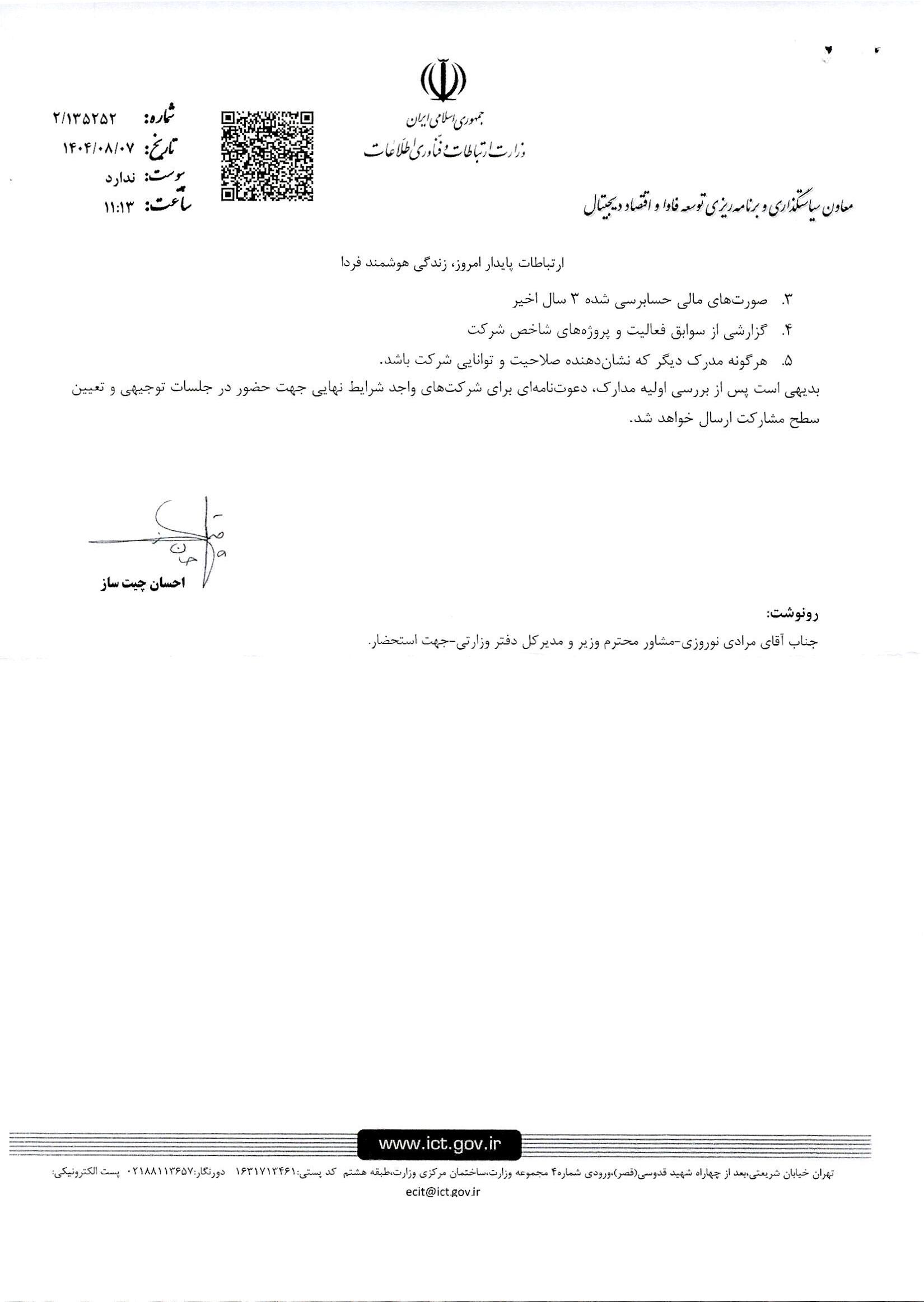 شرکتهای واجد شرایط که تمایل به مشارکت به عنوان سهامدار مؤسس در این صندوق دارند، میتوانند مدارک مورد نیاز را به نشانی تهران، خیابان شرقی، بعد از چهارراه قدوسی، ورودی شماره ۲ ساختمان مرکزی وزارت ارتباطات، طبقه هشتم، معاونت سیاستگذاری و برنامهریزی توسعه فاوا و اقتصاد دیجیتال ارسال کرده یا بهصورت الکترونیکی به آدرس